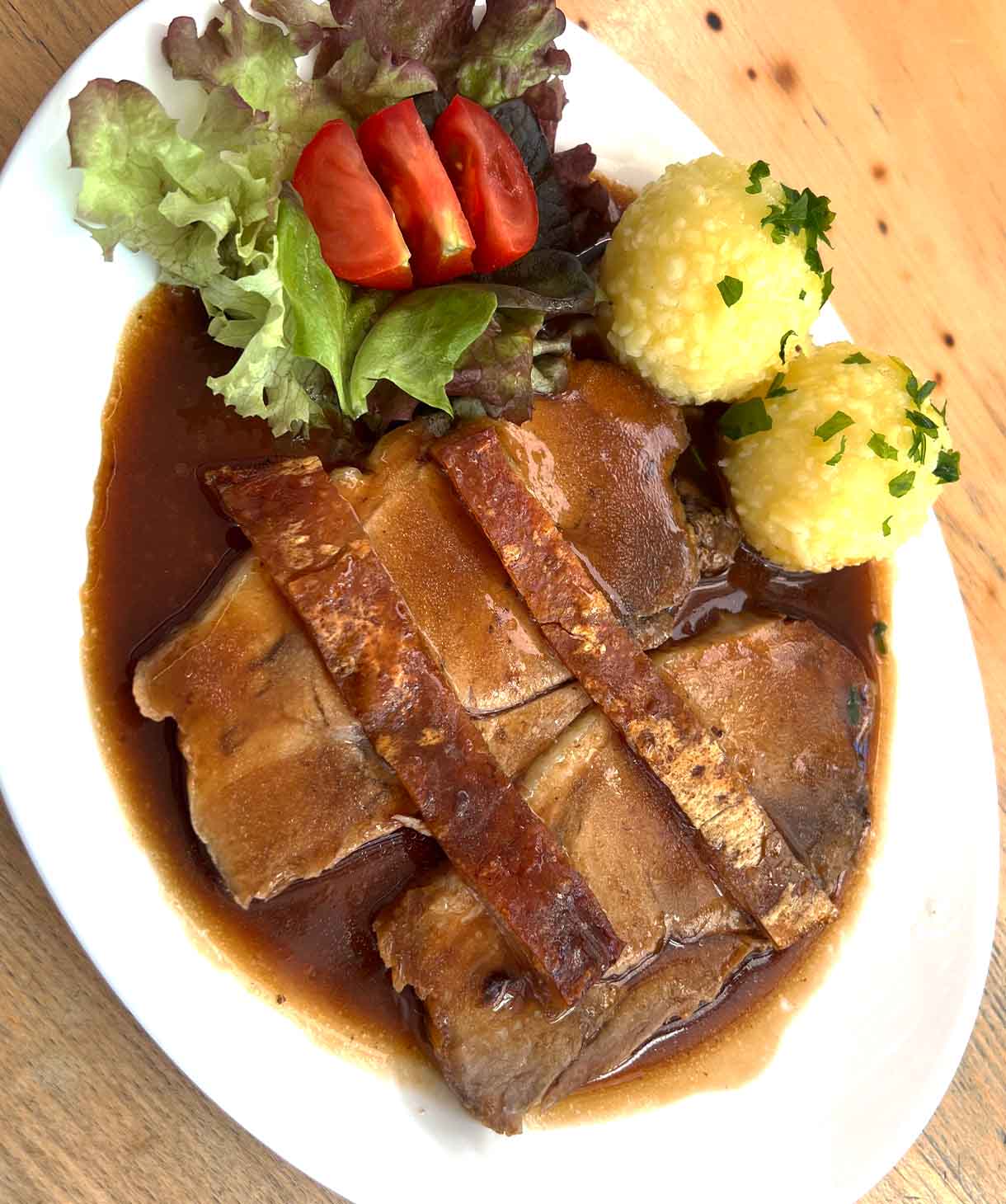 (Schweinefleisch) mit Pommes frites oder Kartoffelsalat
